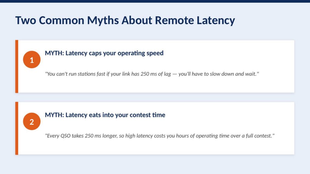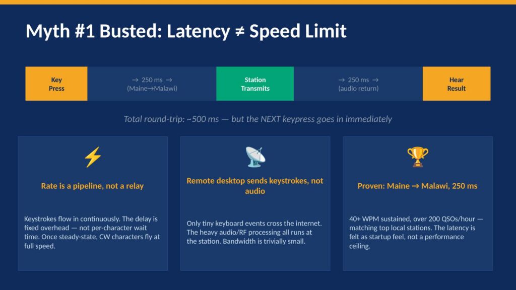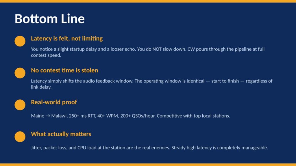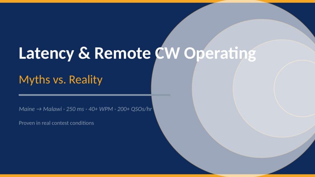 So what does end-to-end latency actually look like in a real remote scenario? To put some concrete numbers on this, I put together a short presentation that walks through the math, busts a couple of common myths, and shows what actually happened operating CW from Maine to Malawi with 250 milliseconds of round-trip latency. Take a look: