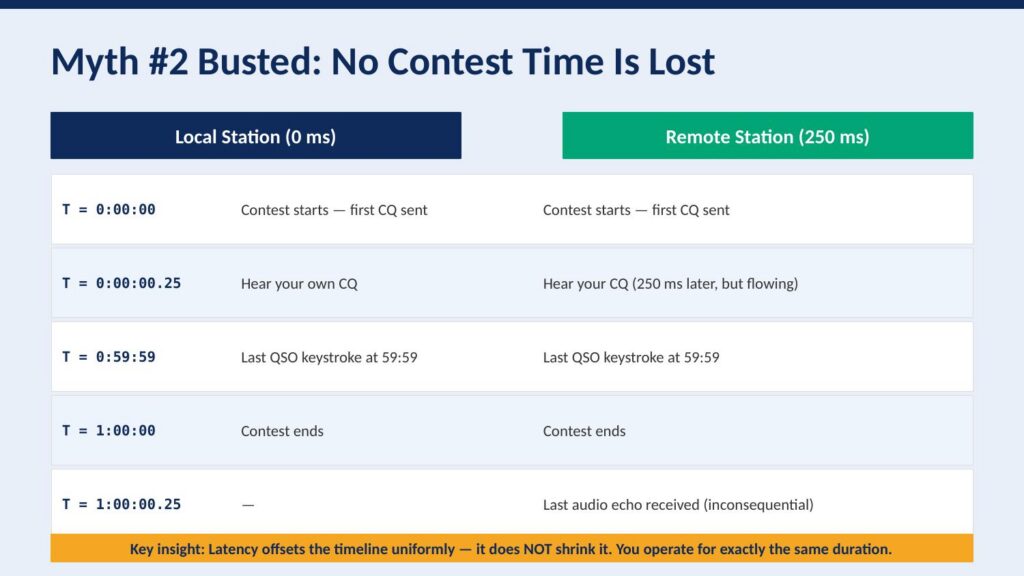 Numbers and diagrams tell part of the story, but nothing is more convincing than actually hearing it. The recording below was captured at the station end during the CQ WPX SSB contest, operating from Maine to a station in Malawi. This is important context: this is not a recording made at the remote operating position, where you might expect to hear some artifact of the internet path. This is what the station itself heard and transmitted. Listen for what is not there: no dropouts, no garbling, no hesitation. It sounds exactly like a local operator sitting in the chair. The pile-ups respond, the exchanges flow, and the rate holds. This is 250 milliseconds of round-trip latency in practice, and as you can hear, it is a complete non-issue for SSB contest operating. (The “ums” and “ahs” are just a side-effect of sleep depravation.)